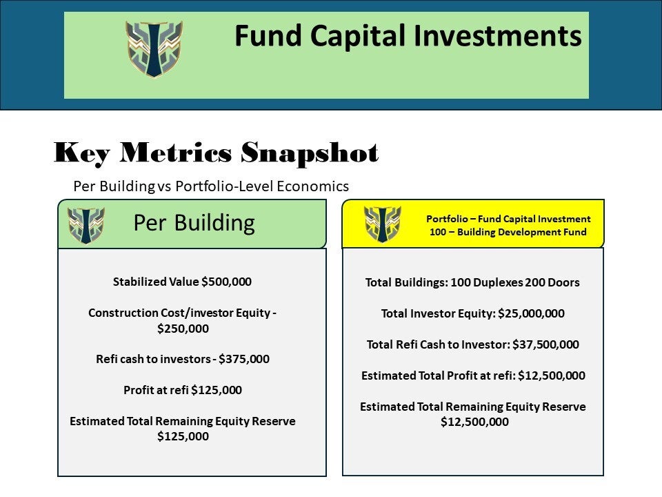 Fund Capital Investments is raising capital for a 100-building duplex portfolio designed to return investor equity quickly while preserving long-term cash flow and upside. We build, lease, refinance, and hold—so investors can target rapid capital return, ongoing income, and equity participation in a professionally managed portfolio.